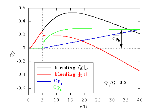 図5より、Cpbはbleeding位置にて急激に上昇し、その後、緩やかに上昇している。十分下流では一定値へと収束している。前節の流れ場において示したようにbleeding位置では収縮部とbleedingからの両者の流れが衝突し、大きなエネルギー損失を生じていると推測される。このCpb分布をz方向についてすべて考慮することは困難なので、十分下流における一定値をbleedingによる圧力損失として評価することとする。