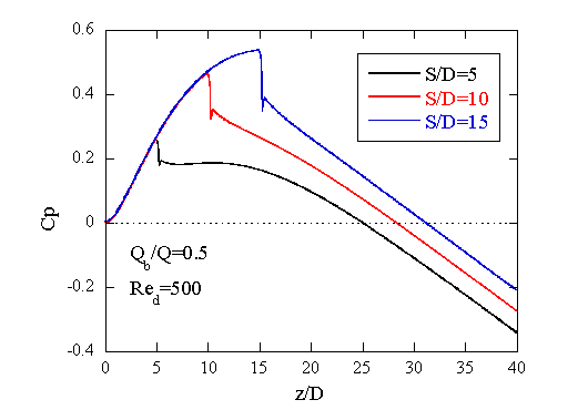 さらに、Cp=0の位置はS/Dの増加に伴い下流へと移動している。また、十分下流(z/D=35〜40)での壁面圧力はS/Dの増加に伴って増加している。