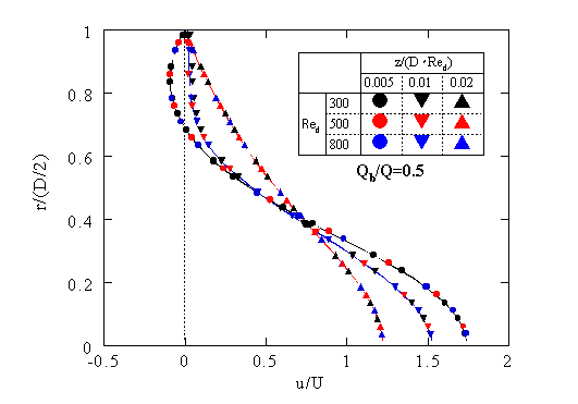 図16の比較をより明確化するために、図17に各Redのz/(D・Red)=0.005, 0.01, 0.02における速度分布を示す。z/(D・Red)=0.01はbleeding中心位置に相当する。縦軸は管中心からの距離rを下流管半径(D/2)で、横軸は位置rにおけるz方向速度uを収縮部内平均流速Uで除して無次元化している。
